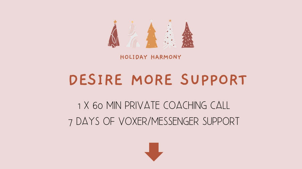 Are you ready to experience a transformation that goes beyond the ordinary? Elevate your Holiday Harmony with our exclusive VIP Upgrade. Dive deeper, receive personalised guidance, and get a few strategies under your belt to help get you through the holidays.